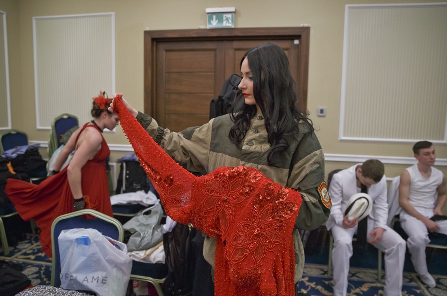 Read moreA Russian-backed rebel fighter watches as colleagues perform during a beauty contest involving women from the main separatist battalions in Donetsk, Ukraine, on March 7, 2015. Self-proclaimed authorities in the rebel-held Donetsk held a beauty pageant for female rebel fighters on the eve of March 8, a women's day widely celebrated throughout the former Soviet Union. #