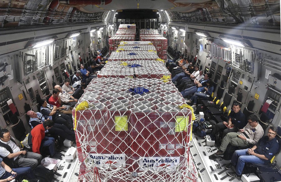 Read moreThis photo taken on March 16, 2015, shows rescuers evacuating a resident onto a trailer and walking past a C-17. The aircraft was carrying relief and assistance as part of a trilateral disaster relief arrangement in the Pacific (FRANZ) between Australia, France, and New Zealand to cyclone-ravaged Vanuatu after Super Tropical Cyclone Pam tore through on March 13. #