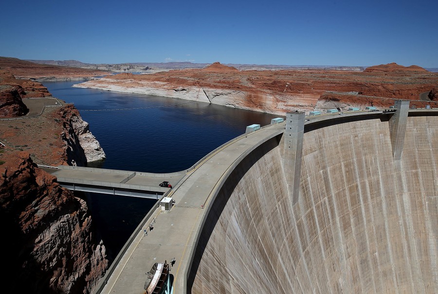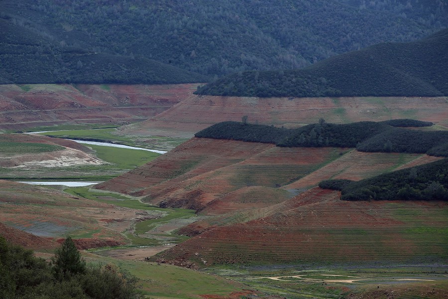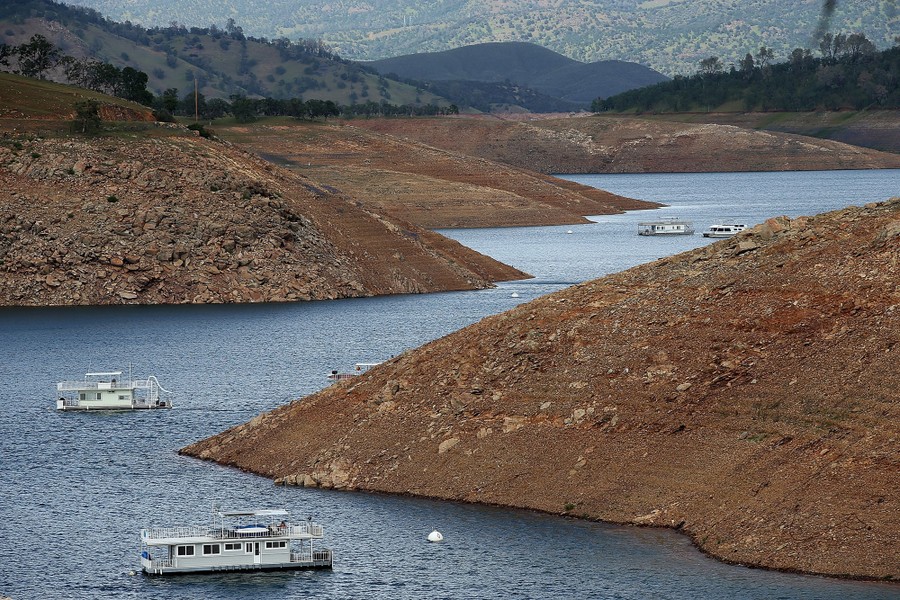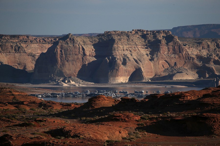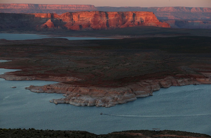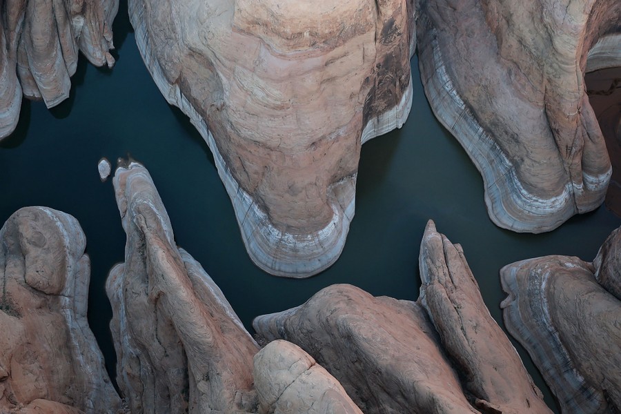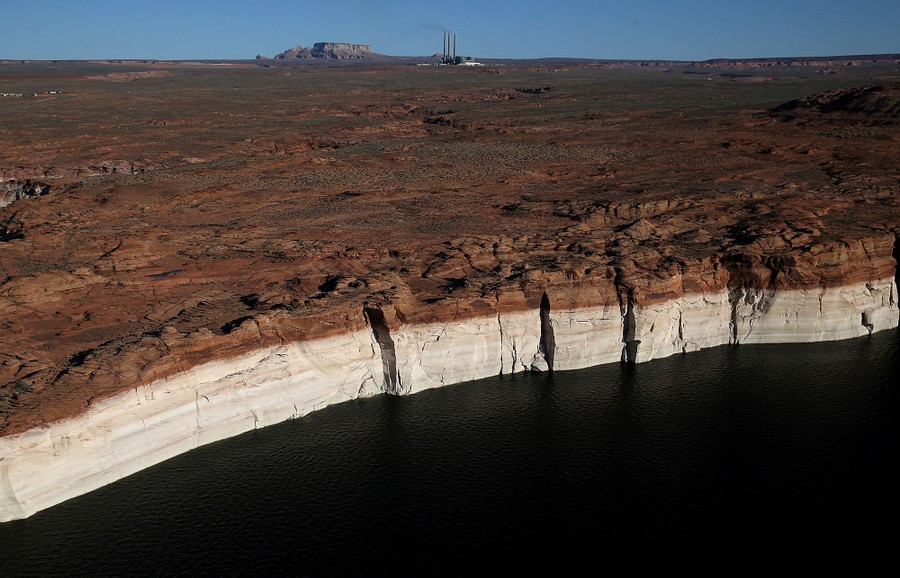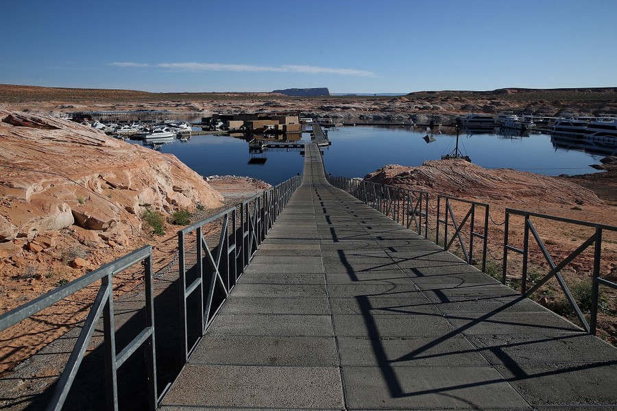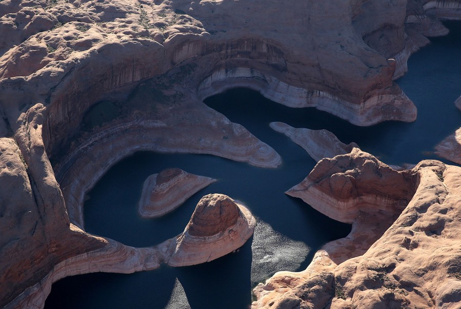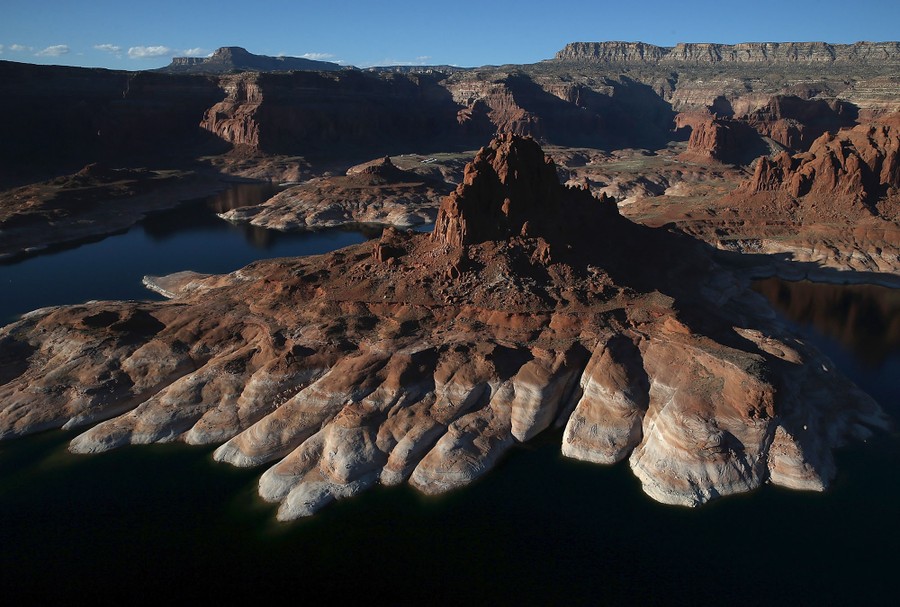 Yesterday, California Governor Jerry Brown stood on a dry, bare hillside in the Sierra Nevada mountains, which would normally be deep under snow at this time of year, and announced an executive order aimed at dramatically reducing water usage statewide. The severity of the drought, now entering its fourth year, has already reached record levels in many places in California and across the West. Lake Powell, a reservoir on the Utah-Arizona border, is currently at 45 percent of capacity and is at risk of reaching the lowest level on record by September. California's snowpack, which generally provides about a third of the state's water, is already at its lowest level on record. Getty Images photographer Justin Sullivan traveled to lakes and reservoirs in California, Utah, and Arizona to capture the following scenes of an increasingly waterless West.