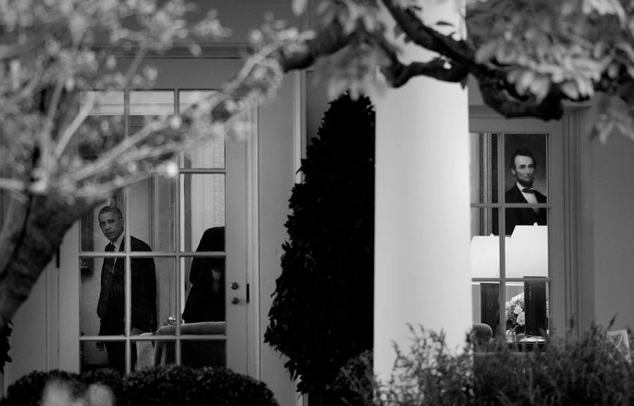 Read moreWinner: Americana. Towards the end of his second term, US President Barack Obama glances out the Oval Office window as a portrait of President Abraham Lincoln is seen through another window of the White House. Photographer: Olivier Douliery #