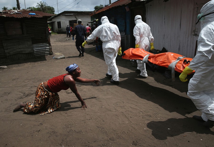 Read moreFrom John Moore's "Ebola Crisis Overwhelms Liberian Capital". A woman crawls towards the body of her sister as Ebola burial team members take her away. #