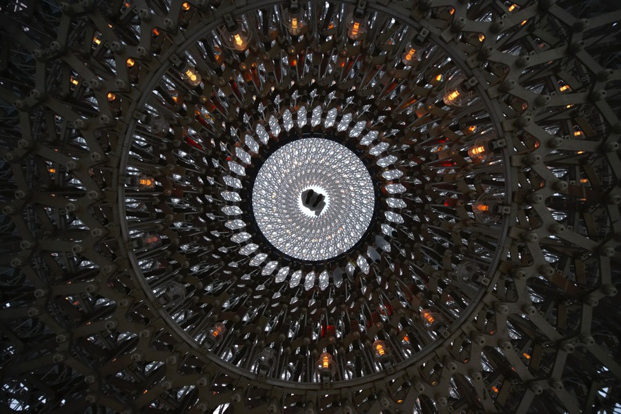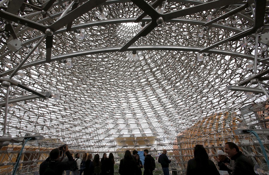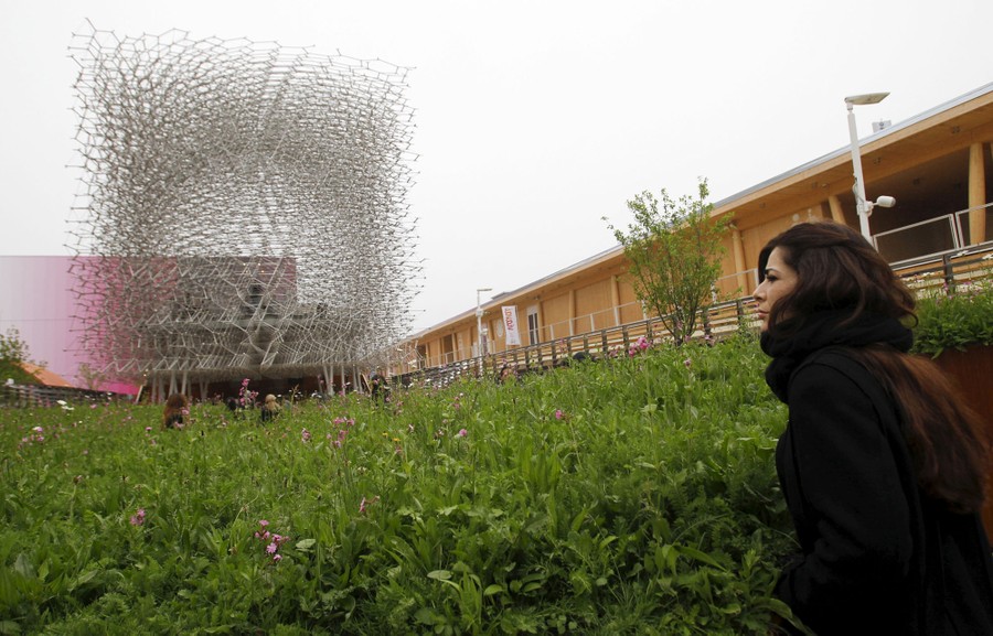 Read moreA visitor is seen from below as he stands in the geometrical center of the honeycomb structure of the United Kingdom pavilion at the 2015 Expo in Milan on May 2, 2015. The giant aluminium beehive is a cuboid lattice that forms the centerpiece of the design. Audio-visual devices embedded within the hive allow it to pulse, buzz and glow according to desired effects; including live signals from a real beehive where accelerometers measure the vibrational activity of the bees and these signals are fed into an array of LED lights embedded within the sphere, generating a dynamic representation of the insects’ activity. #