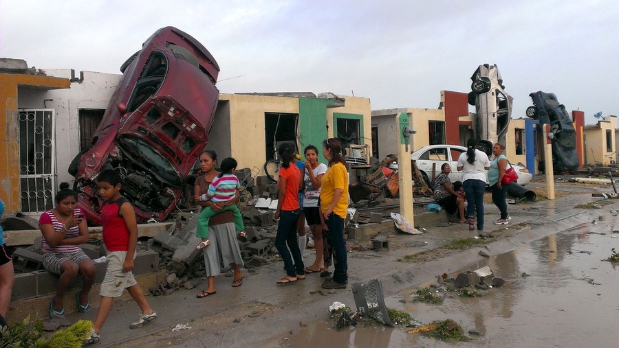Read moreResidents stand outside their homes and damaged cars after a tornado hit the town of Ciudad Acuna, state of Coahuila, Mexico, on May 25, 2015. At least 13 people died on Monday morning after a tornado hit Ciudad Acuna, on the border with Texas, Mayor Evaristo Lenin Perez said. #