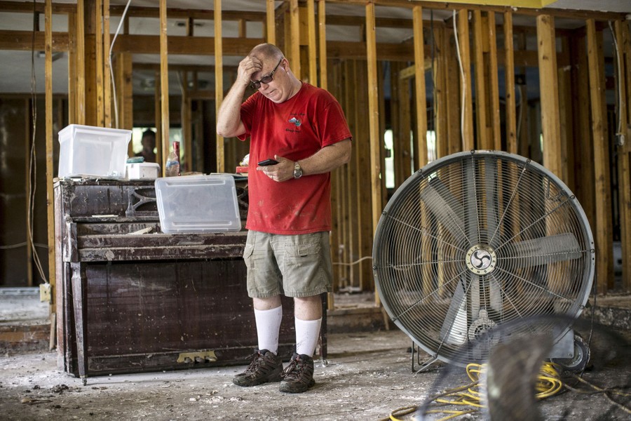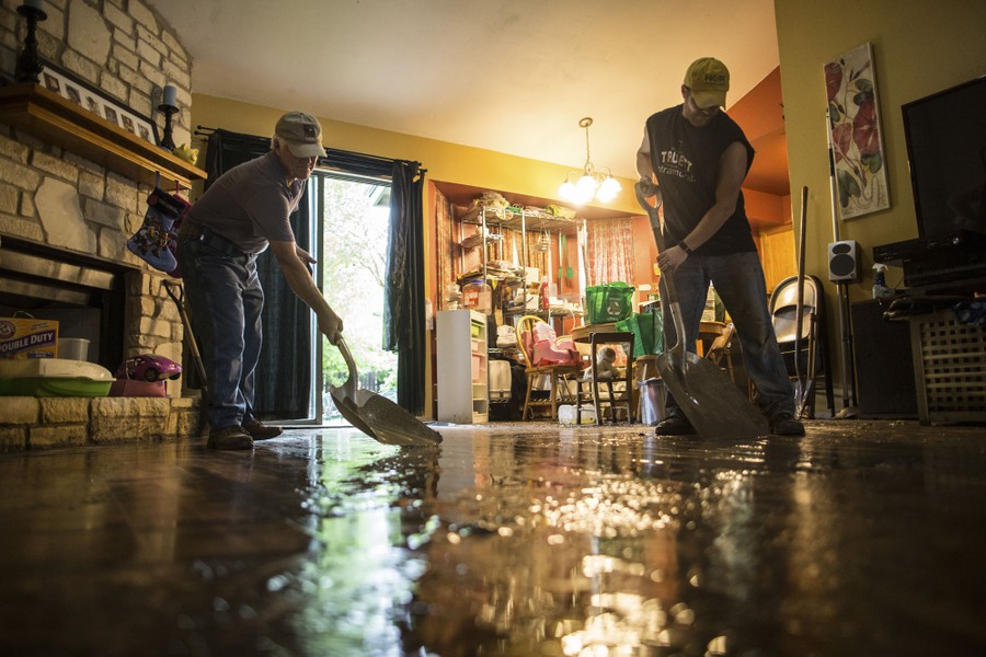 Read moreDon Simons (left) and Clint Followel, volunteers from the First Baptist Church in San Marcos, Texas, help clean Toby McLroy's flood-damaged home in San Marcos on May 26, 2015. #