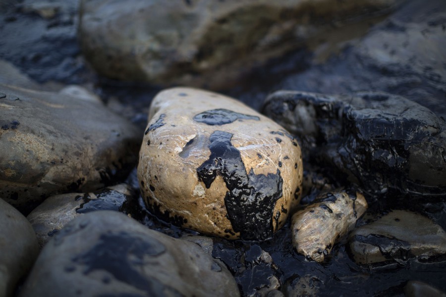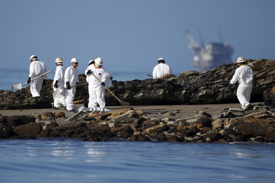 Read moreLocal residents Josh Marsh (left) and Morgan Miller scan the oil-covered rocks at Refugio State Beach for animals who may have been affected by an oil spill caused by a pipeline rupture, in Goleta, California, on May 19, 2015. #
