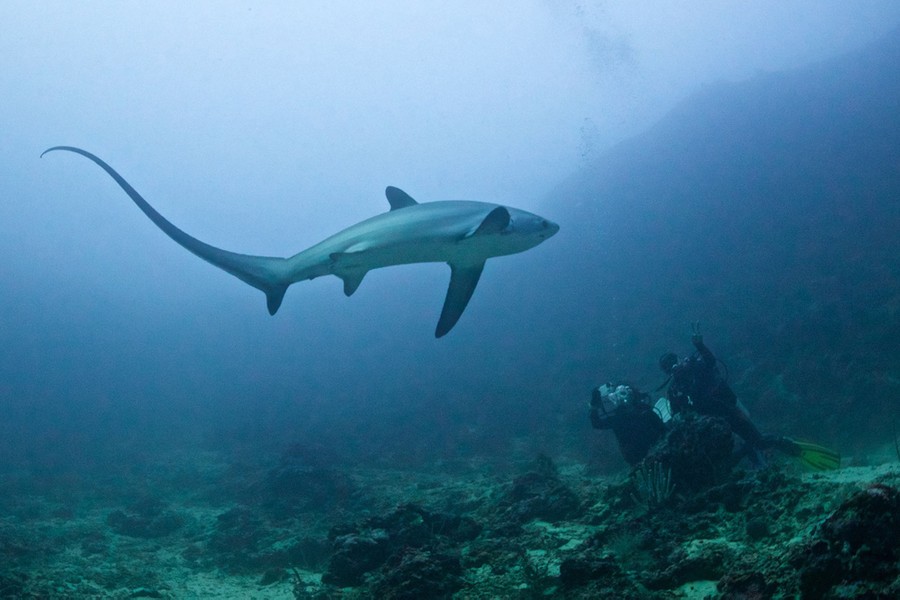 Read moreA beautiful Pelagic Thresher shark gets surprisingly close to two divers at Monad Shoal, Malapascua Island, Philippines. Monad Shoal is the only spot in the world where thresher shark sightings are guaranteed. Naturally shy and skittish, this encounter is special as the shark was just a few meters away. Taken at 6am in the morning on May 16, 2015 at a depth of 35m/115 feet using natural light only as strobes are not allowed. #
