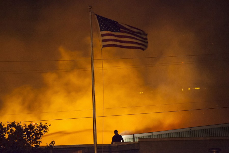 Read moreA U.S. flag is seen as a commercial building burns after being ignited by the Sleepy Hollow fire in Wenatchee, Washington, on June 29, 2015. Emergency officials ordered hundreds of people to leave their homes in central Washington state as the fast-moving wildfire destroyed at least nine properties and threatened businesses on Sunday. Many took refuge in shelters as the blaze ripped across 1,700 acres near the cities of Cashmere and Wenatchee in Chelan County, about 120 miles (200km) east of Seattle. #