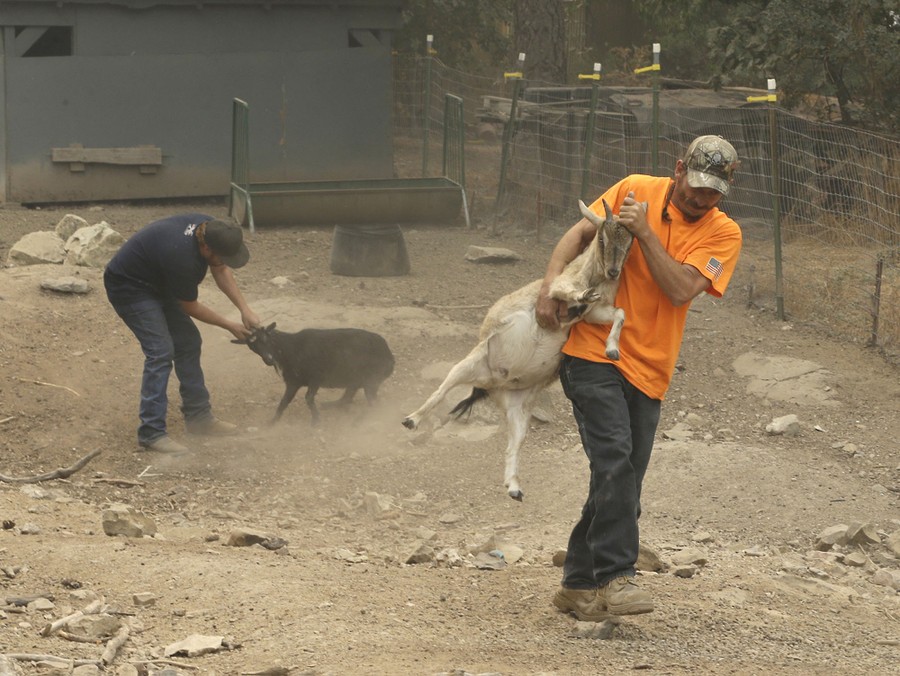 Read moreAnimal rescue group volunteer Chad Hughes, right, carries a goat to a trailer from a home threatened by a fire near Railroad Flat, California, on September 13, 2015. #