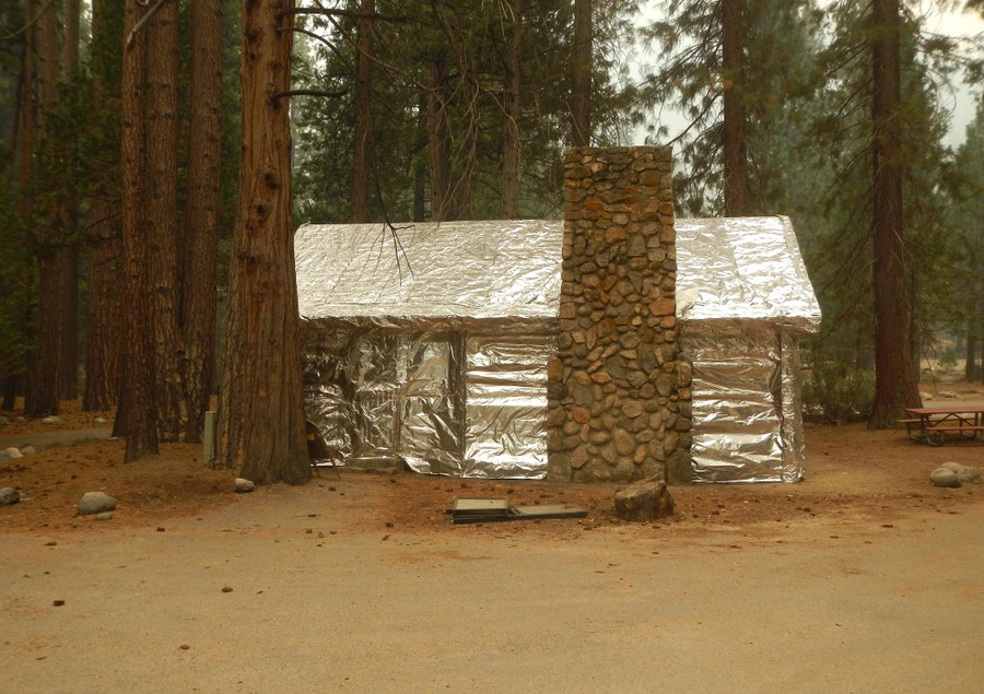 Read moreA cabin sits wrapped in aluminized structure wrap in Sentinel Campground near Cedar Grove, California. For several years now, the U.S. Forest Service has been deploying reusable sheets of aluminized structure wrap to protect selected buildings from radiant heat and burning embers.The sheeting reflects up to 95 percent of radiant heat, according to one manufacturer’s website. #