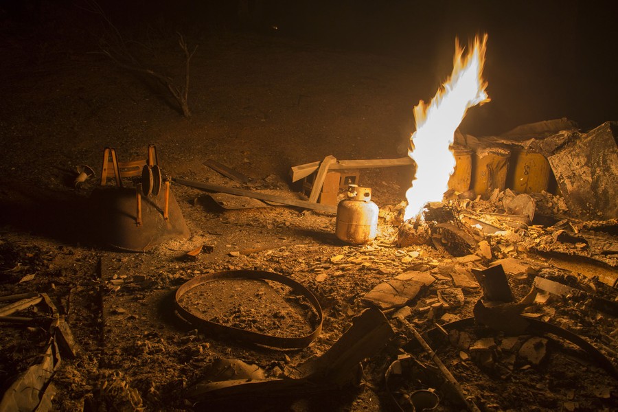 Read moreFlames from a backfire on Highway 29 rise above a firefighter battling the Valley Fire in Lower Lake, California, on September 13, 2015. The swiftly spreading wildfire destroyed hundreds of homes and forced thousands of residents to flee as it roared unchecked through the northern California village of Middletown and nearby communities, fire officials said on Sunday, September 13. #
