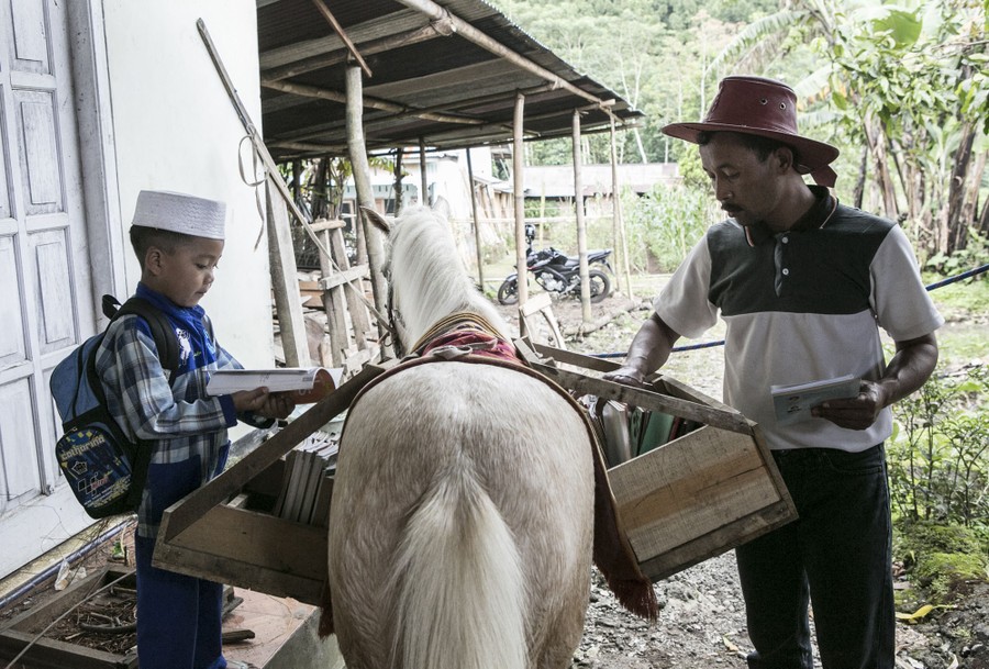 Read more42-year-old Ridwan Sururi prepares books while a boy selects book from the mobile library in Serang Village, Purbalingga, Indonesia, on May 5, 2015. Ridwan, a horse caretaker from Serang Village, started the mobile library using a horse named “Kudapustaka” in January of 2015 with book donations from a number of friends and other donors. Every week on Tuesday, Wednesday, and Thursday he visits nearby schools with Kudapustaka to offer books to the children. #