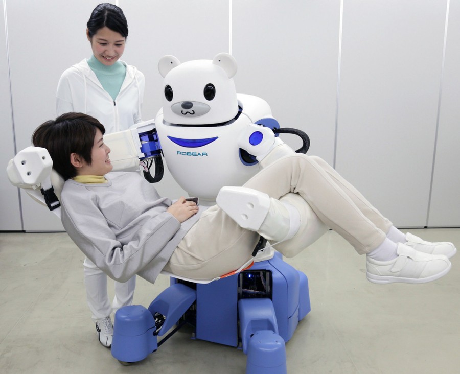 Read moreThis picture taken on February 23, 2015, shows a polar bear robot “Robear” lifting a woman for a demonstration in Nagoya, central Japan. The Robear, developed by Riken Institute and Sumitomo Riko, has a polar cub-like face with big doe eyes, but packs enough power to transfer frail patients from a wheelchair to a bed or a bath. A historically low birth rate and ever-increasing life expectancy means Japan's population of elderly people is growing, while the pool of youngsters to look after them is shrinking. #