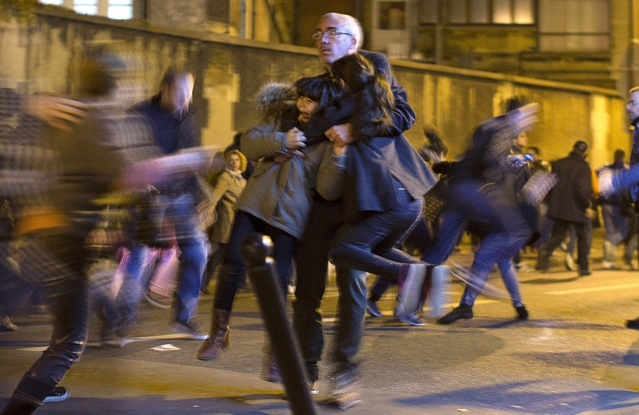 Read moreA man carries two children after panic broke out among mourners who paid their respects at the attack sites at restaurant Le Petit Cambodge (Little Cambodia) and the Carillon Hotel in Paris, on November 15, 2015. Thousands of French troops were deployed around Paris on Sunday, and tourist sites stood shuttered in one of the most visited cities on Earth, while investigators questioned the relatives of a suspected suicide bomber involved in the attacks. The incident pictured here turned out to be a false alarm. #