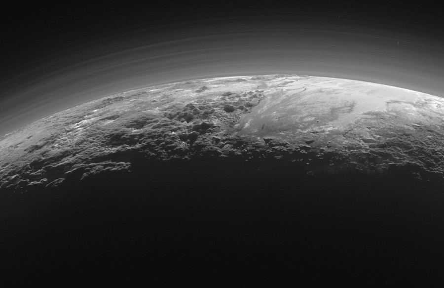 Read moreJust 15 minutes after its closest approach to Pluto on July 14, 2015, NASA’s New Horizons spacecraft looked back toward the sun and captured this near-sunset view of the rugged, icy mountains and flat ice plains of Pluto, extending to the horizon. The smooth expanse of the informally named icy plain Sputnik Planum (right) is flanked to the west (left) by rugged mountains up to 11,000 feet (3,500 meters) high, including the informally named Norgay Montes in the foreground and Hillary Montes on the skyline. To the right, east of Sputnik, rougher terrain is cut by apparent glaciers. The backlighting highlights over a dozen layers of haze in Pluto’s tenuous but distended atmosphere. The image was taken from a distance of 11,000 miles (18,000 kilometers) from Pluto. #