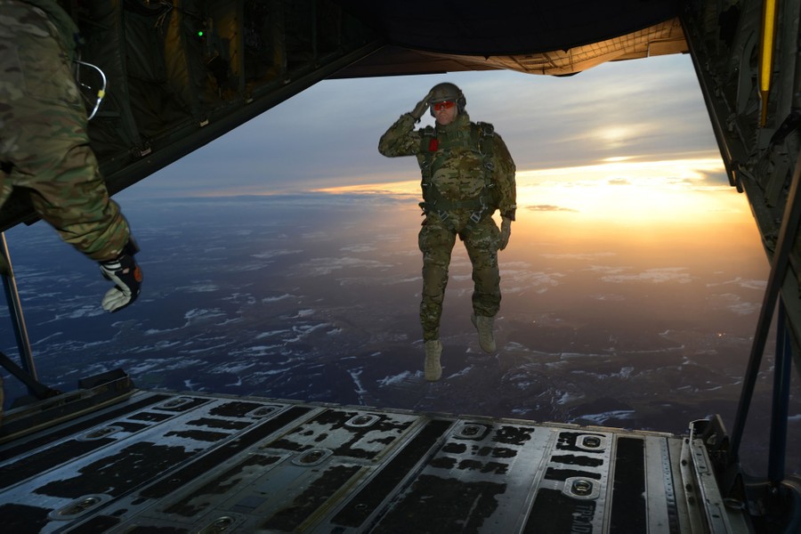 Read moreA U.S. soldier assigned to 1st Battalion, 10th Special Forces Group (Airborne) salutes his fellow Soldiers while jumping out of a C-130 Hercules aircraft over a drop zone in Germany on February 24, 2015. #