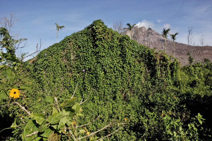 Read moreWild plants overgrow the rubble of a house as Mount Sinabung looms in the background, above the abandoned Sibintun village in North Sumatra on November 12, 2015. #