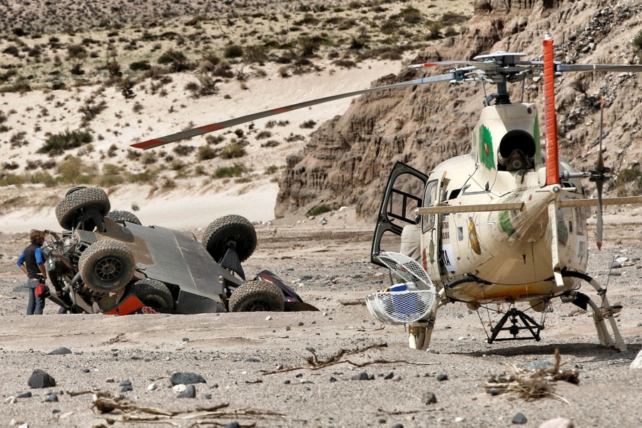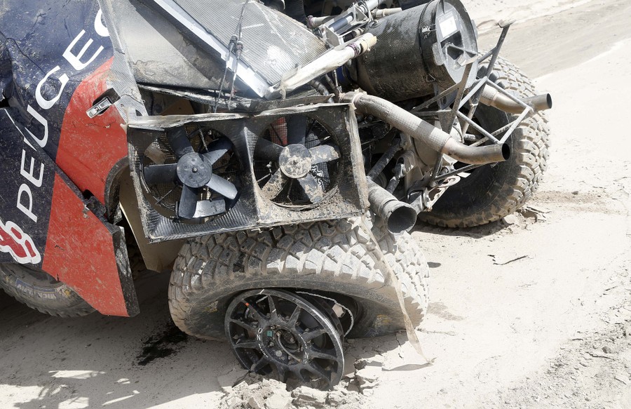 Read moreView of Peugeot French driver Sebastien Loeb and co-driver Daniel Elena's overturned car after it was put back on its wheels during Stage 8 between Salta and Belen, Argentina, on January 11, 2016. #