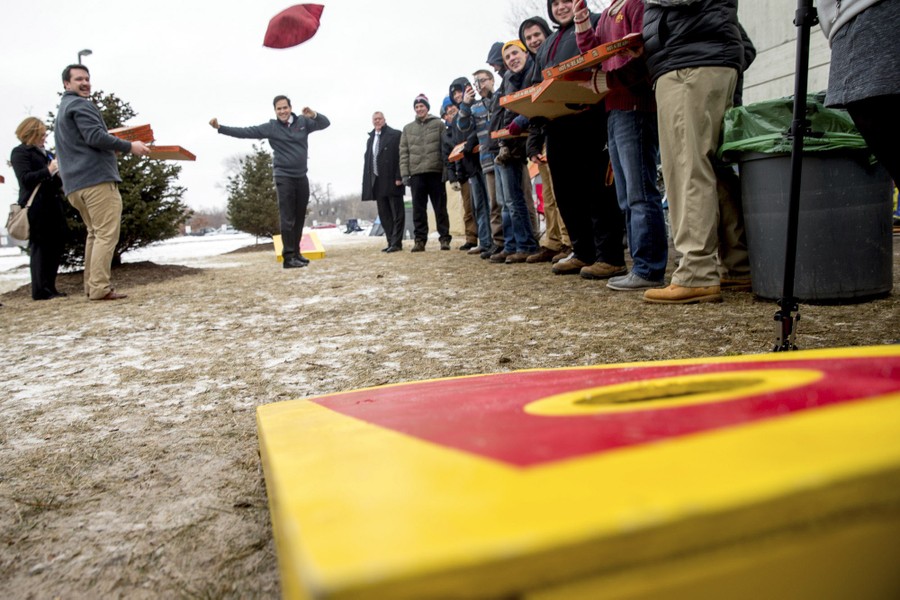 Read moreRepublican presidential candidate, Senator Marco Rubio plays corn hole after handing out pizza to Iowa State University Students camping out for basketball tickets on campus, after speaking at a town hall at the Iowa State University Alumni Center in Ames, Iowa, on January 23, 2016. #