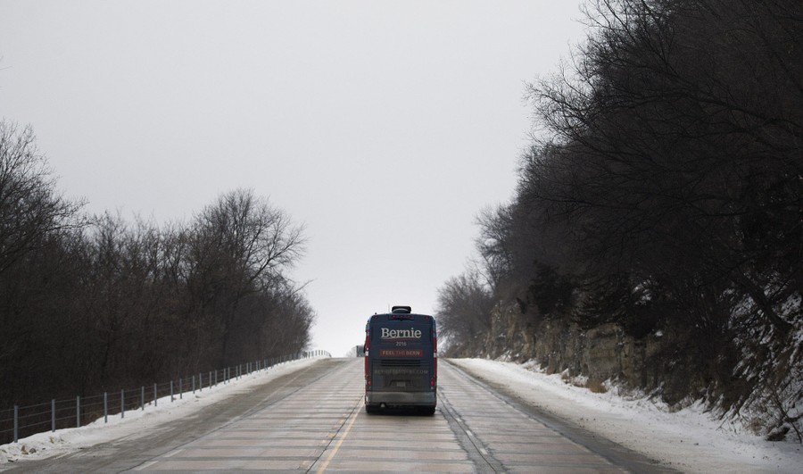 Read moreA campaign bus carrying Democratic presidential candidate, Senator Bernie Sanders travels down the road after a campaign event at Luther College on January 24, 2016, in Decorah, Iowa. #