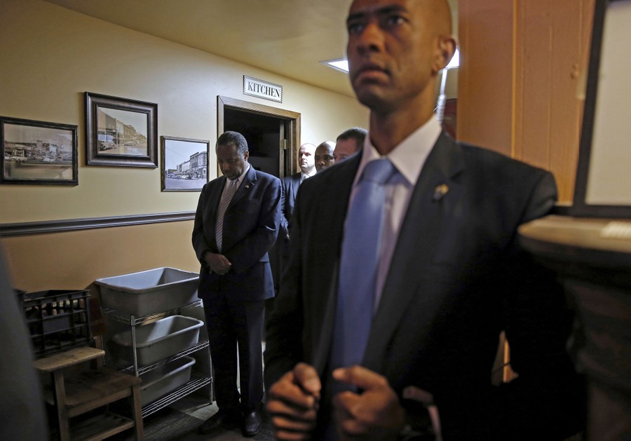 Read moreA Secret Service agent provides security for Republican presidential candidate Ben Carson before the start of a campaign event in Creston, Iowa, on January 22, 2016. #