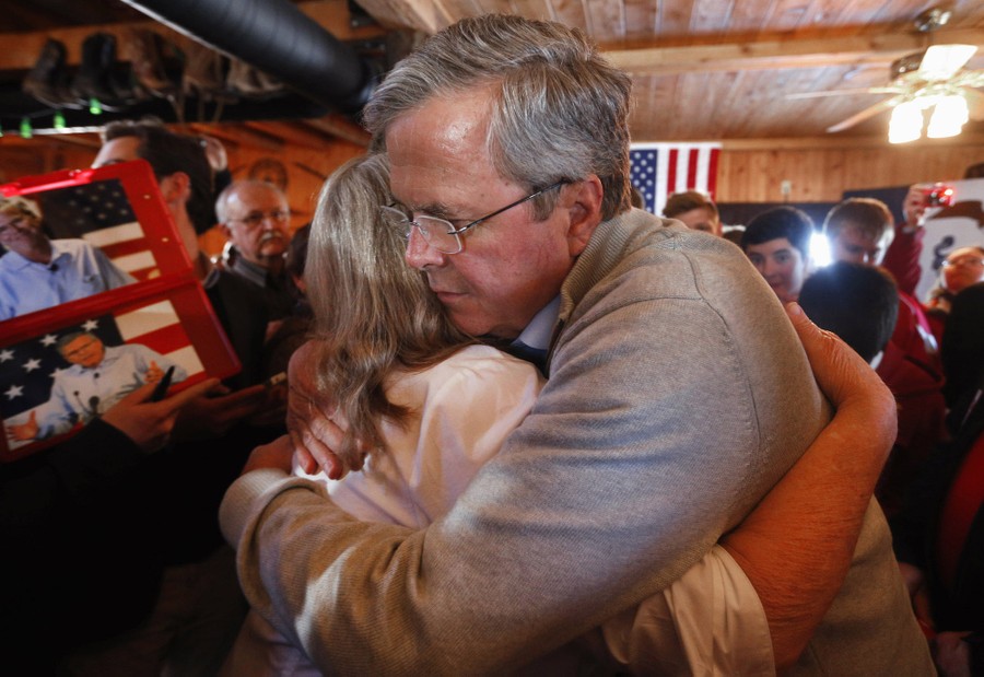 Read moreRepublican presidential candidate and former Florida Governor Jeb Bush hugs an audience member during a campaign event at Greasewood Flats Ranch, on January 29, 2016, in Carroll, Iowa. #