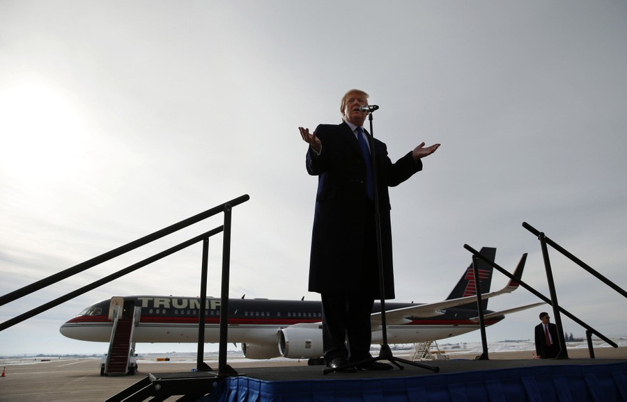 Read moreRepublican presidential candidate Donald Trump speaks in front of his airplane during a campaign event at Dubuque Regional Airport, on January 30, 2016, in Dubuque, Iowa. #