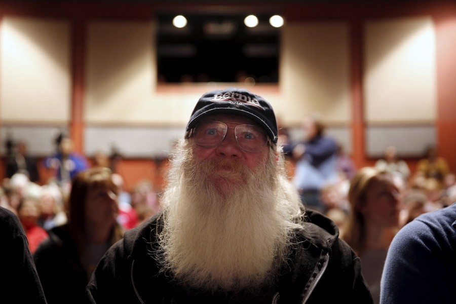 Read moreJim Stuart of Elgin, Iowa, listens as Democratic U.S. presidential candidate, Senator Bernie Sanders speaks during a campaign event at Wartburg College in Waverly, Iowa, on January 8, 2016. #