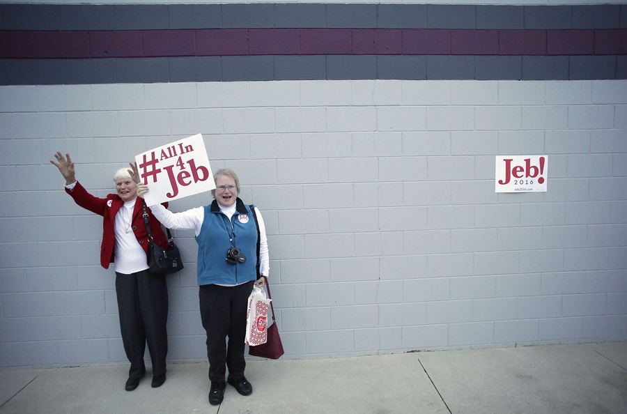 Read moreTwo women watch as Republican presidential candidate Jeb Bush departs the Cedar Falls Eagles Club in his vehicle after a campaign event on January 30, 2016, in Cedar Falls, Iowa. #