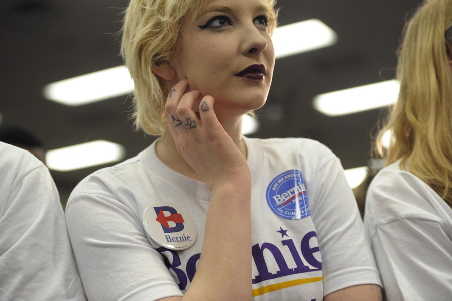 Read moreA volunteer at U.S. Democratic presidential candidate Bernie Sanders's campaign event wears a shirt decorated with Sanders's image in Fort Dodge, Iowa, on January 19, 2016. #