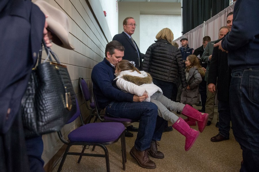 Read moreRepublican presidential candidate Senator Ted Cruz kisses his daughter Catherine, 4, as she plays on his lap while he waits offstage before being announced by radio and television personality Glenn Beck at a rally at the Five Sullivan Brothers Convention Center in Waterloo, Iowa, on January 23, 2016. #