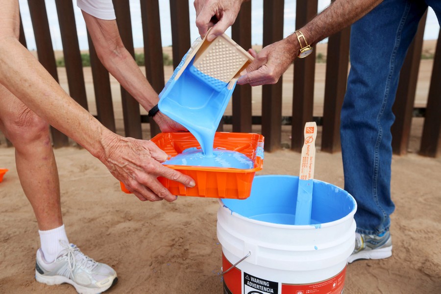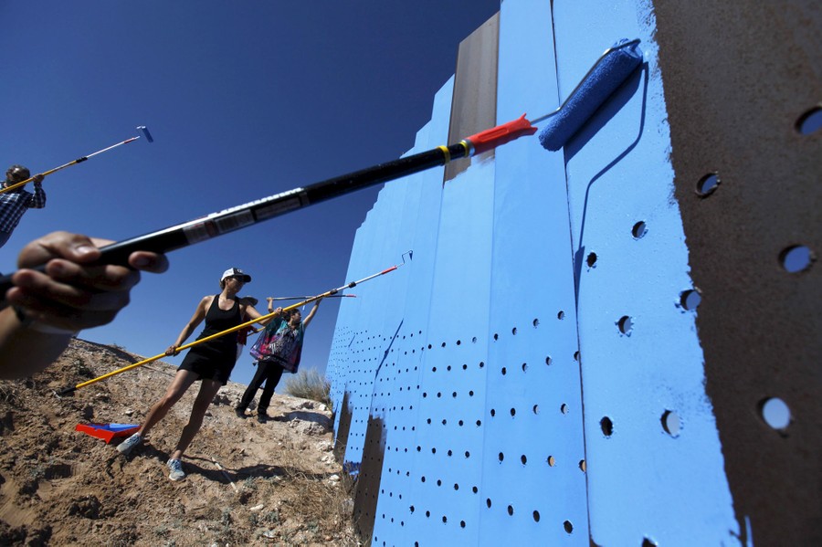 Read moreVolunteers paint the border fence between the United States and Mexico to give the illusion of transparency during the Borrando la Frontera, or Erasing the Border, art project in Mexicali, Mexico, on April 9, 2016. #