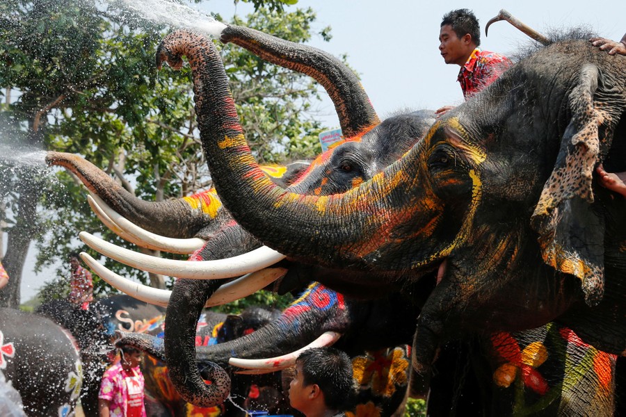 Read moreA man plays a trumpet while people are splashed by elephants with water during the celebration of the Songkran water festival in Thailand's Ayutthaya province, north of Bangkok, on April 11, 2016. #