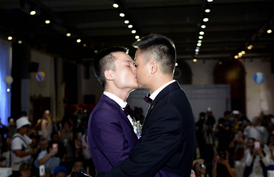 Read moreHu Mingliang (right) and his partner Sun Wenlin kiss during their legally unrecognized wedding ceremony in Changsha, central China's Hunan province, on May 17, 2016. Hu and Sun tied the knot in a wedding ceremony on May 17, where imitation marriage certificates were presented despite a Chinese court’s ruling against the two men seeking to marry on April 13, 2016. #