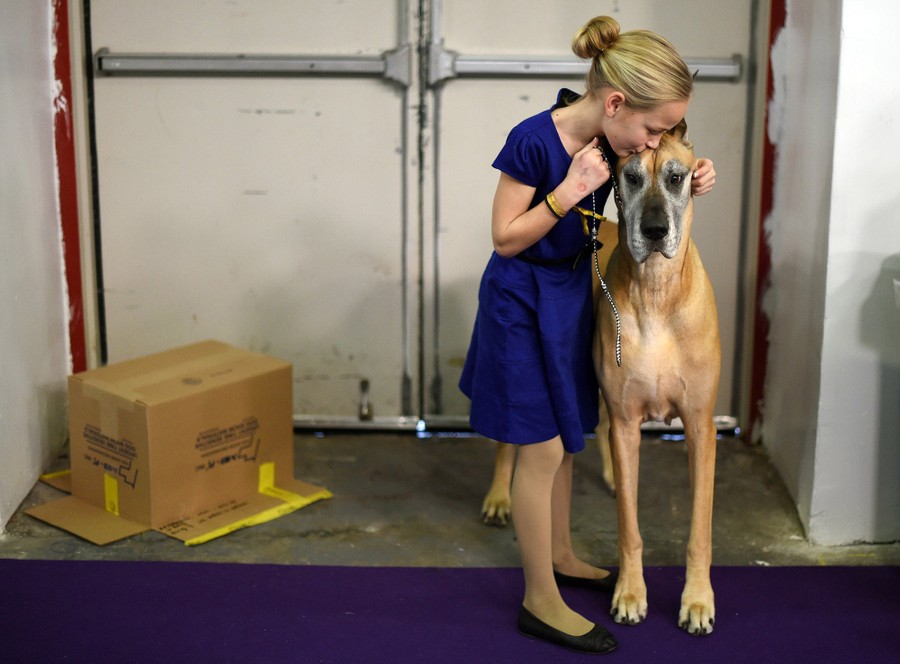 Read moreEmma Rogers, 11, from Columbus, New Jersey, and Great Dane “Joy” in the benching area at Pier 92 and 94 in New York City, on the 2nd day of competition at the 139th Annual Westminster Kennel Club Dog Show, on February 17, 2015. #