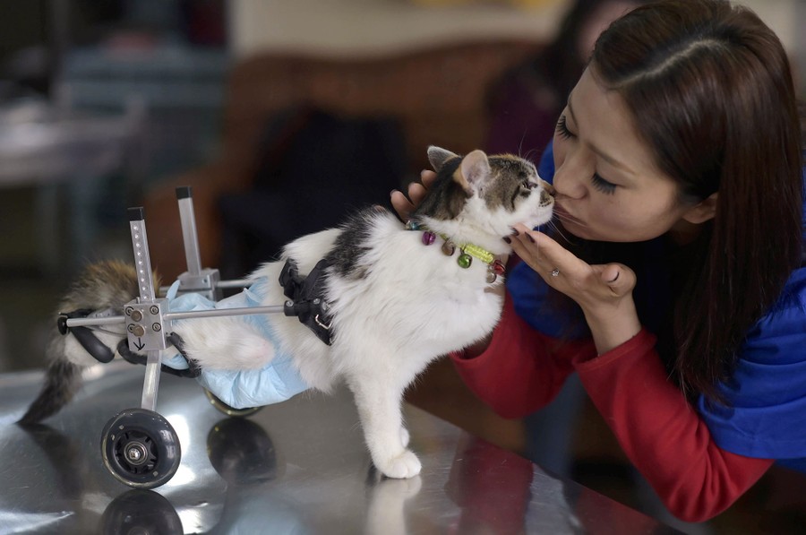 Read moreA veterinarian kisses an 8-month-old cat, wearing a prosthetic two-wheel device, at a veterinary hospital in Chongqing municipality, China, on March 16, 2015. The cat lost the ability to walk with its rear legs after falling from the ninth to the fifth floor of a building last November. #