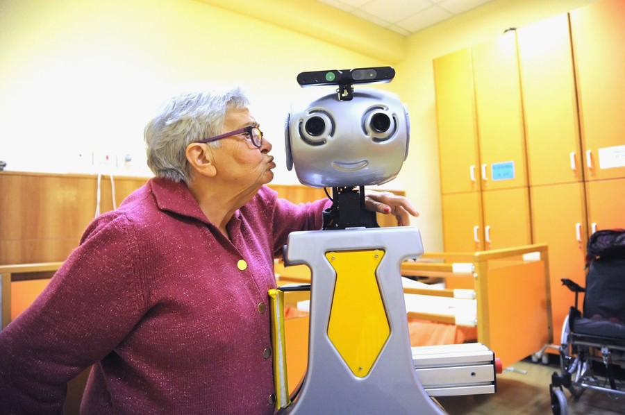 Read moreA woman kisses a robot during daily activities of the Robot-Era project at the Residenza Sanitaria Assistenziale San Lorenzo, on December 19, 2015, in Florence, Italy. At the nursing residence, a robot acts as a perfect caregiver or butler for the 20 elderly guests. Robots developed within the Robot-Era project coordinated by the Robotics Institute of the Scuola Superiore Sant'Anna di Pisa are designed and programmed to perform functions in the house, outside, and in the condominium. The EU-supported project Robot-Era is the world's largest experiment ever done on service robotics, involving 160 people in real-world environments over four years. #