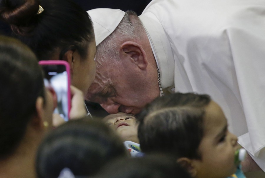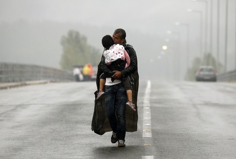 Read moreA Syrian refugee kisses his daughter as he carries her through a rainstorm towards Greece's border with Macedonia, near the Greek village of Idomeni, on September 10, 2015. #