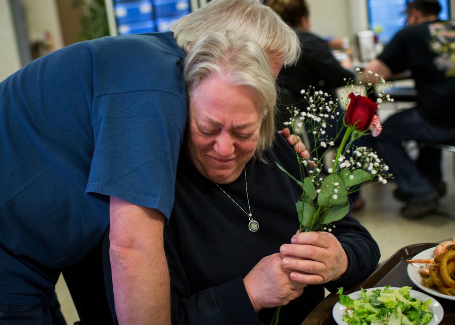 Read moreDella Joseph, a coach driver helping residents of Fort McMurray escape the raging wildfires, breaks down while receiving a Mother’s Day rose from a thankful Albertian while staying at a camp in Wandering River, Alberta, on May 8, 2016. #