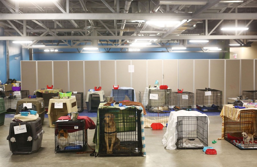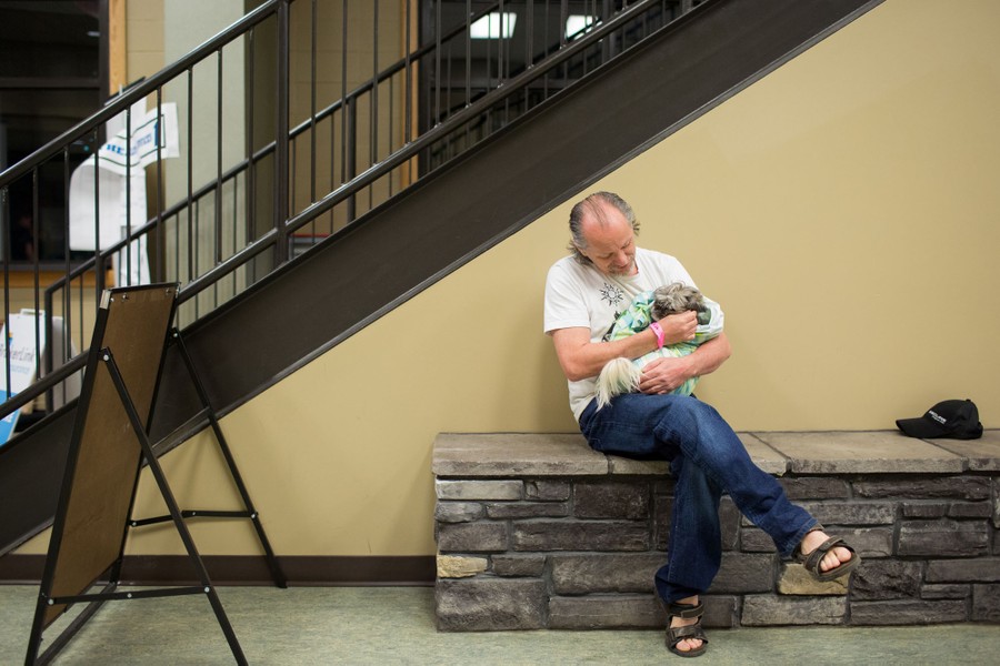 Read moreA resident of Fort McMurray embraces his dog while at the Bold Center in Lac La Biche, Alberta, where evacuees have been living since leaving their Fort McMurray homes due to the raging wildfires, on May 9, 2016. #