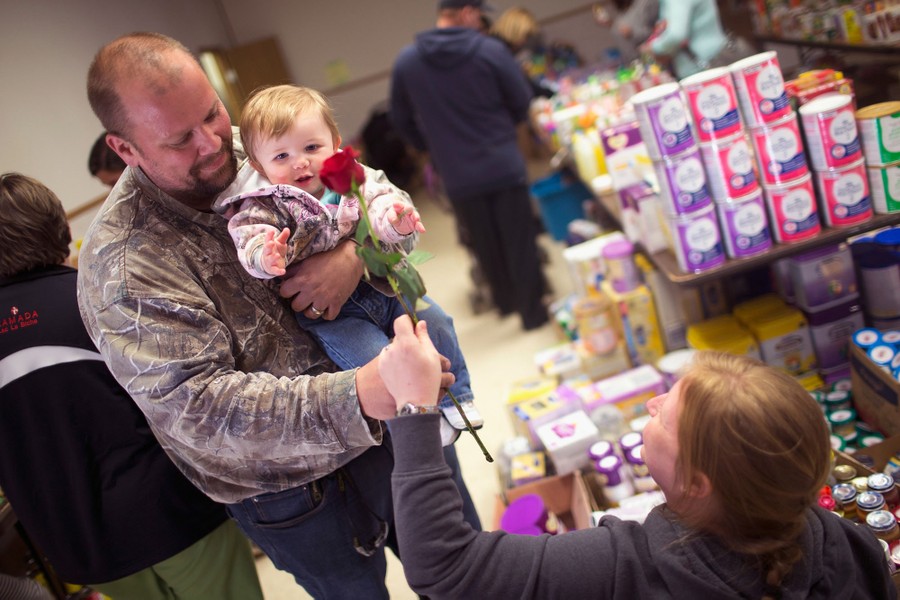 Read morePhillip McDonald, holding his 10-month-old daughter Ashley, gives a Mother's Day rose to his wife Valerie as they searched for necessities at a donation center established to help evacuees forced from their homes by the Fort McMurray wildfire on May 8, 2016, in Winding River, Alberta. #