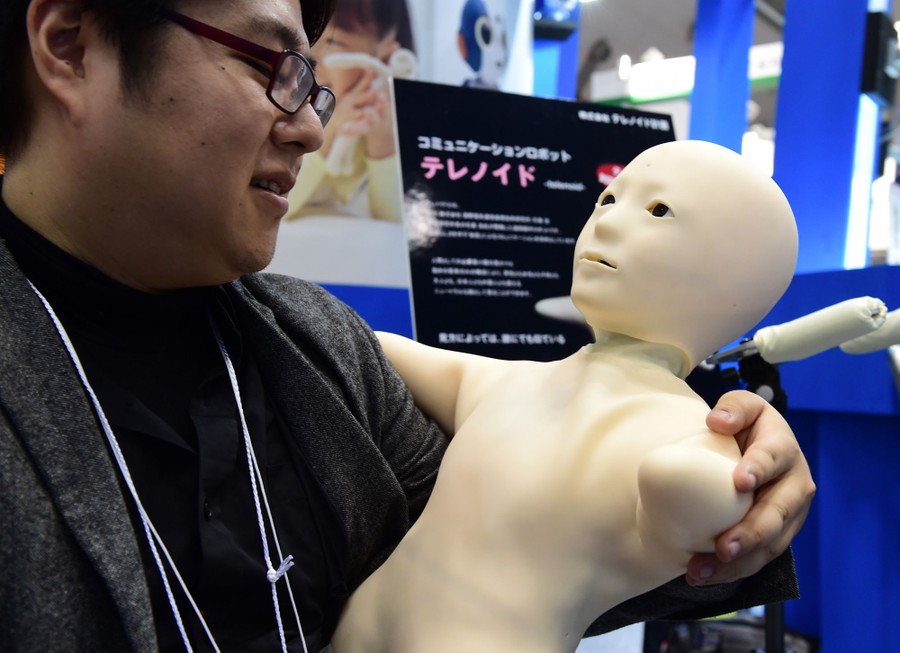 Read moreAn employee from Japan's robot venture Telenoid Planning chats with humanoid robot ‘Telenoid,’ shaped like a child and composed of minimal human features such as a head, a face, and upper body, developed by the Osaka University professor Hiroshi Ishiguro, at the annual International Robot Exhibition in Tokyo on December 3, 2015. The robot is designed for remote education and elderly health care. #