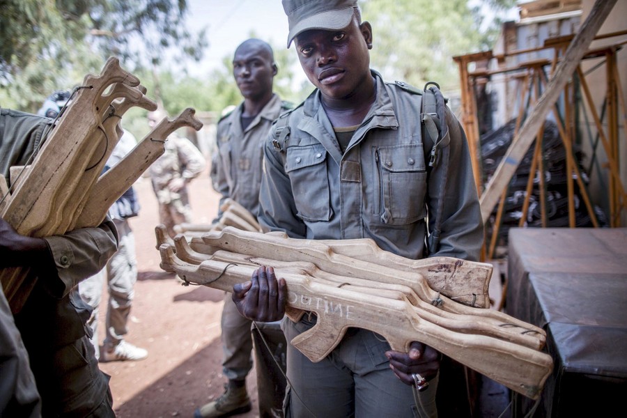 Read moreA Malian soldier carries mock weaponry for training during the visit of German Defence Minister Ursula von der Leyen (unseen) to the EUTM military training mission in Koulikoro, Mali, on April 6, 2016. #