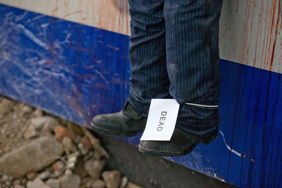 Read moreA label reading “Dead” is pictured attached to the leg of a dummy hanging from a London Underground train in rubble during the Exercise Unified Response (EUR) planned training exercise combining all aspects of British emergency services, in Dartford, England, on March 1, 2016. Britain's emergency services and search and rescues teams took part in a training exercise simulating a building collapse onto a London underground station. #