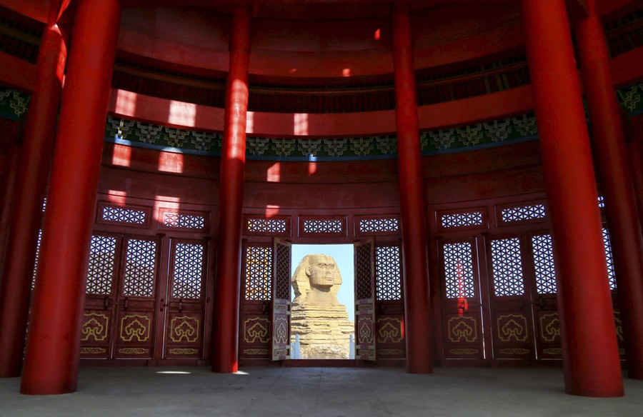 Read moreA replica of the Sphinx is seen through a door on a building, which is made by half of a replica of the Qinian Hall of the Temple of the Heaven and half of a western building, at a studio for film and television production on the outskirts of Shijiazhuang, Hebei province, China, on December 3, 2015. #