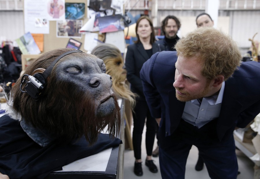 Read moreBritain's Prince Harry takes a closer look at a robotic mask during a tour of the Star Wars sets at Pinewood studios in Iver Heath, west of London, on April 19, 2016. Prince William and Prince Harry were touring Pinewood to visit the production workshops and meet the creative teams working behind the scenes on the Star Wars films. #