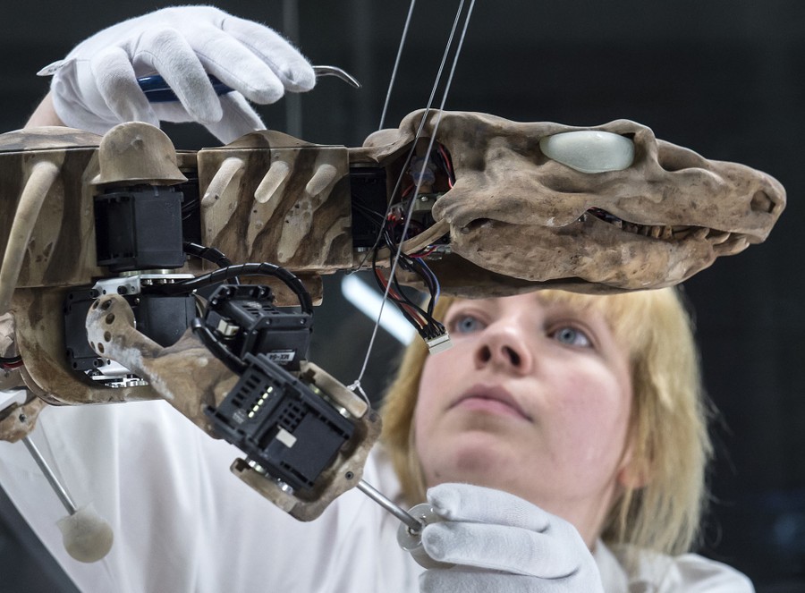 Read moreThe preparator Stefanie Griebsch fixes the bio-inspired robot ‘Orobot’ during a press preview exhibition called ‘Orobates - After 300 million years reanimated’ in the Phyletic Museum in Jena, Germany, on April 15, 2016. Scientists studied the movement processes of the 297-million-year-old prehistoric lizard Orobates pabsti and displayed the results in a special presentation. #