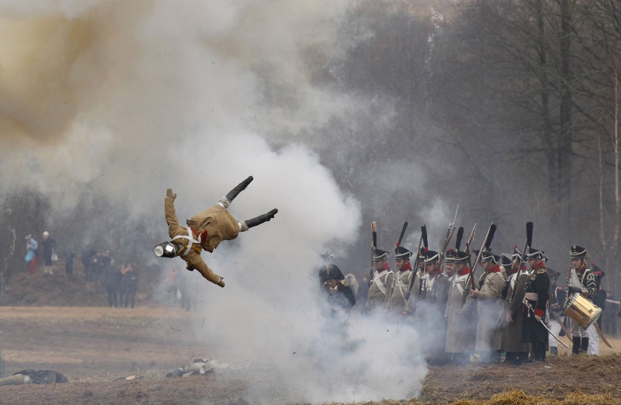 Read moreMen dressed as 1812-era Russian and French soldiers re-enact a staged battle as a dummy soldier is blown up, near the Belarus village of Bryli, on November 24, 2012, to mark the 200th anniversary of the Battle of Berezina during Napoleon's army retreat from Russia. #