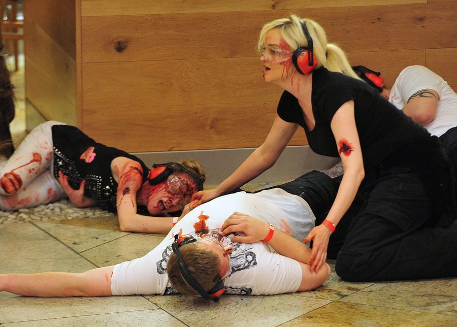 Read moreActors play the part of casualties during a simulation of an attack by a suicide bomber inside a shopping center in Manchester, England, on May 10, 2016. Police in Greater Manchester joined forces with other agencies to carry out a simulated terror attack to test the emergency response to a major terror incident. #