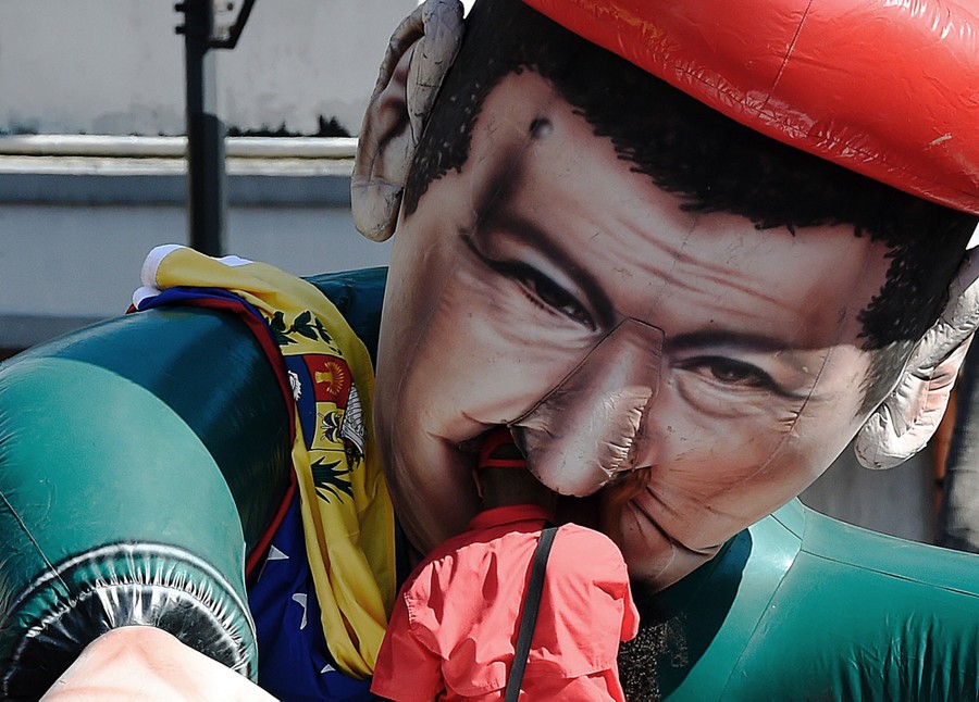 Read moreA man helps to erect an inflatable doll depicting late President Hugo Chavez during a rally of PDVSA workers with President Nicolas Maduro (unseen) outside the Miraflores presidential palace in Caracas, Venezuela, on January 12, 2016. #