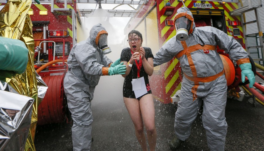 Read moreFrench firemen wearing chemical protective suits take part in a mock chemical attack exercise at the Geoffroy Guichard Stadium in Saint-Etienne, France, on April 4, 2016, in preparation of security measures for the UEFA 2016 European Championship. #